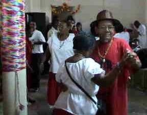 In parang, there are two primary dance styles: a slow castillian waltz, and the quicker duple-feel gavilan style. The castillian waltz always brings the older parranderos to the dance floor, the remnants of a rural Trinidadian cocoa-estate community. The couple in this first photo are dancing the castillian, a waltz-style dance in a slow, stately pace. In this dance, the couple must maintain a “respectable” distance apart from each other, as in the European ballroom waltz. The couple is almost always male-female in this dance, and it is rare to see someone dancing solo.