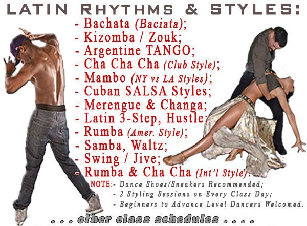 BEGINNERS – INTERMEDIATE: Merengue / Salsa / Mambo / Rumba / Bachata / Cha Cha / Argentine TANGO / Salsa Rueda.